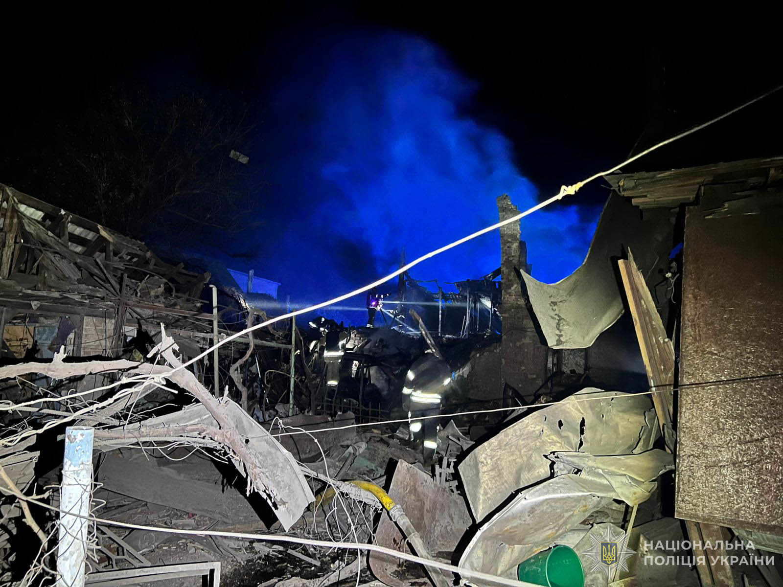 Руйнування в приватному домоволодінні в Запорізькій області на тлі диму від займання, освіченого фарами машин рятувальниківЩе троє цивільних травмувались у Райгородку та Старорайському.