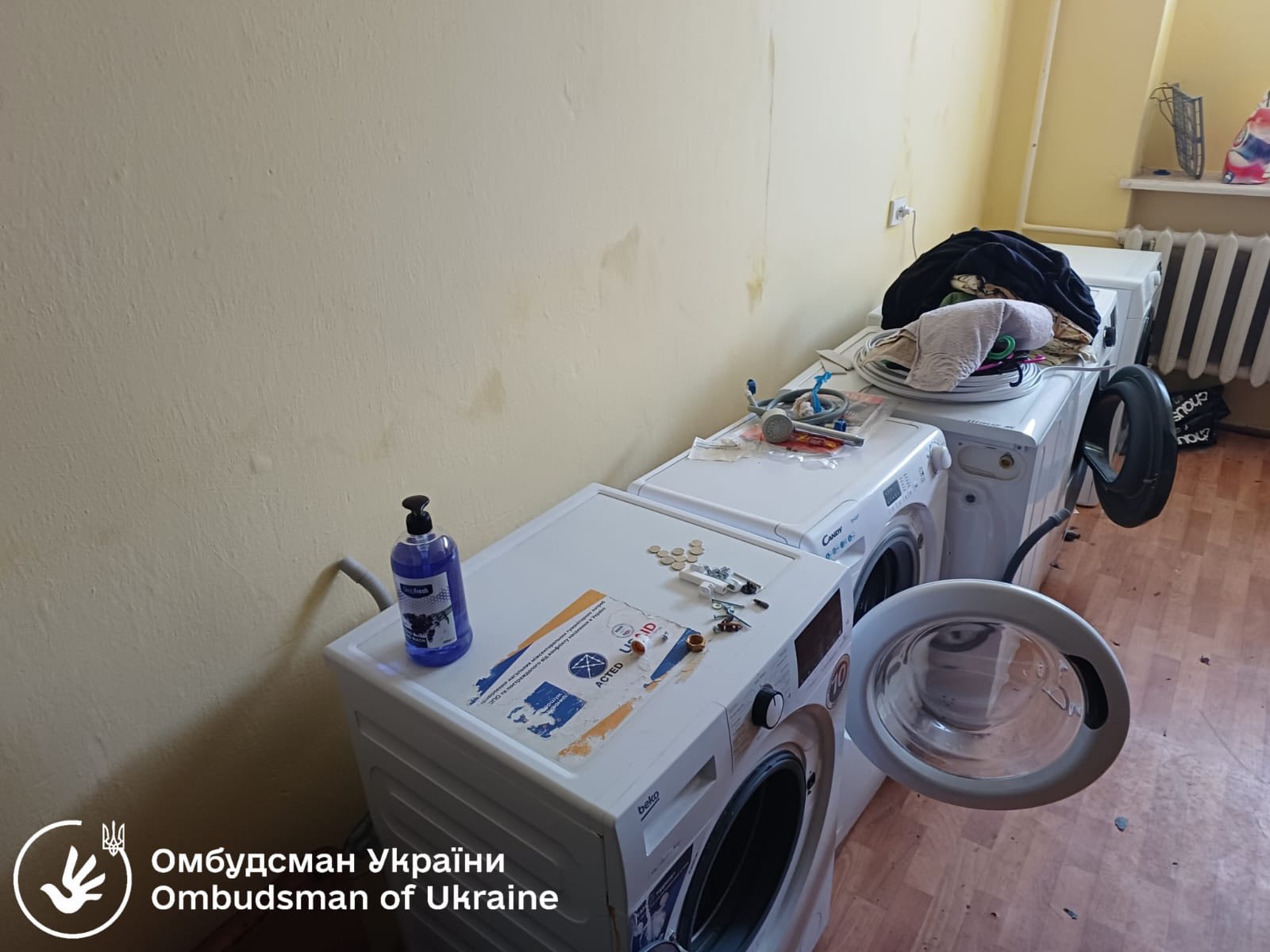 Частину приміщень, відремонтованих для проживання ВПО за підтримки міжнародних партнерів, фактично використовують студенти. У санвузлах і спеціально облаштованій кімнаті для прання більшість пральних машин не працює.