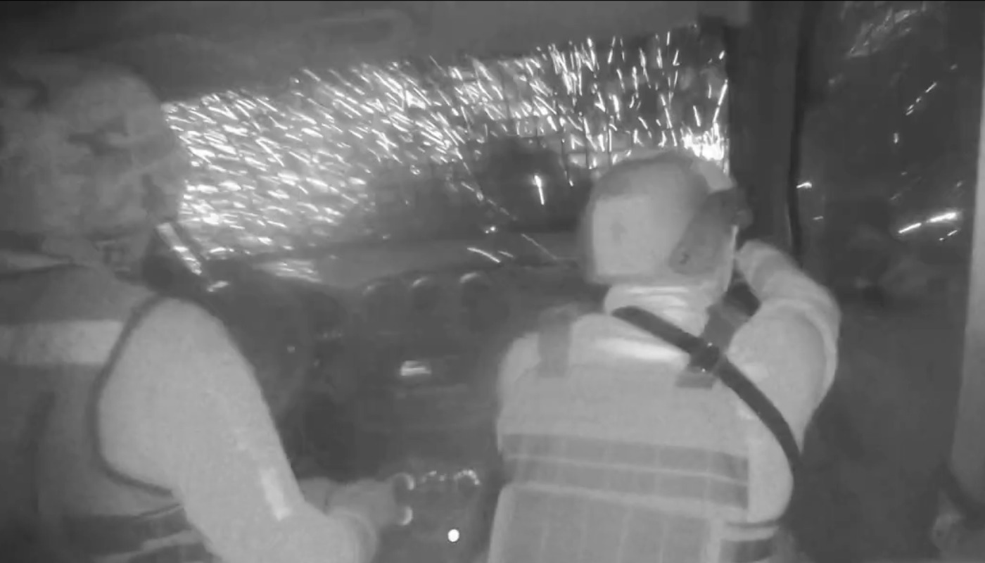 Момент влучання вибухівки по авто. Скриншот відеоЕвакуаційний екіпаж вночі їхав до села Зміївка, щоб допомогти виїхати з небезпеки 56-річній жінці та її 75-річній маломобільній матері.