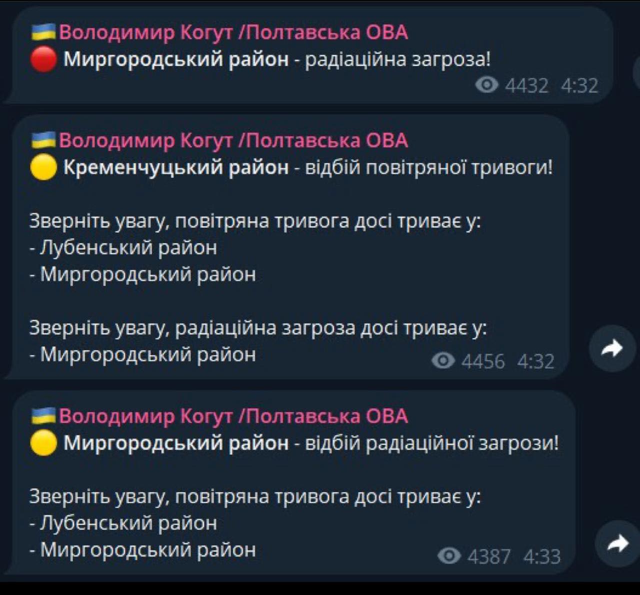 Посадовець пояснив, що під час тривоги через атаку дронів система помилково оголосила інший сигнал. Через це радіаційну загрозу оголосили в Миргородському районі.