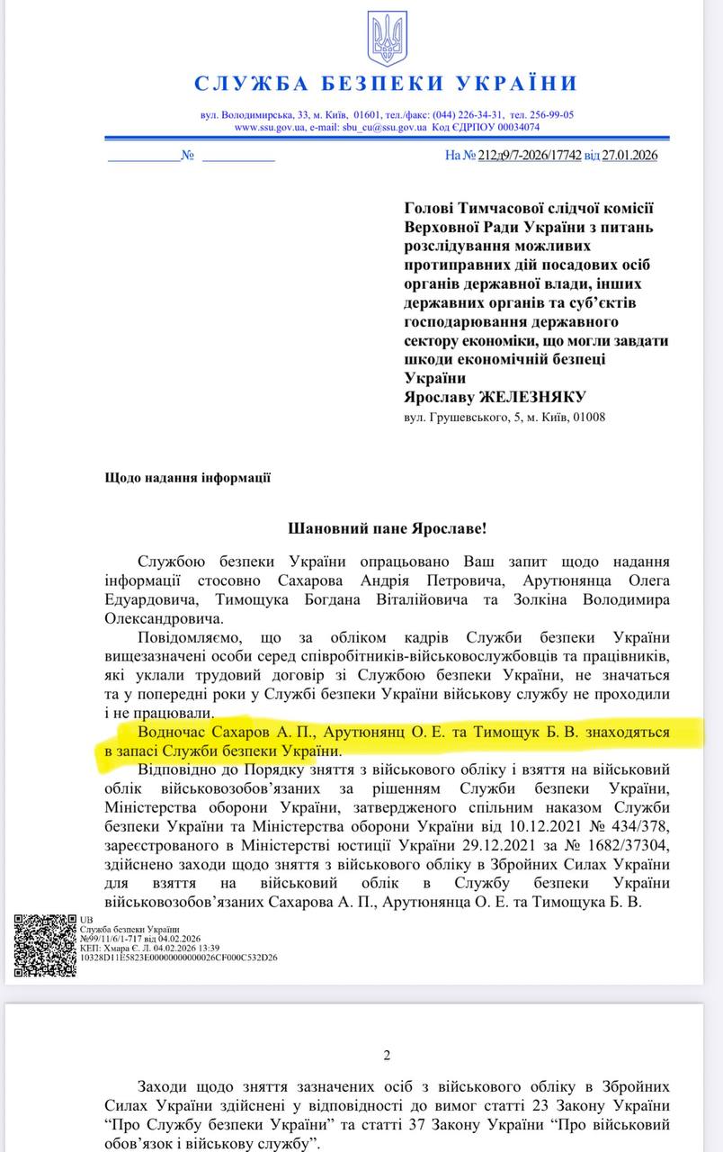 “Служба безпеки України проігнорувала засідання антикорупційного комітету, де розглядали питання можливого тиску на НАБУ і САП. Так само вона не взяла участі і в нашому засіданні. Водночас у своєму офіційному листі СБУ повідомила, що Олег Арутюнянц, Богдан Тимощук та Андрій Сахаров перебувають у запасі служби. У 2024–2025 роках їх зняли зі спецобліку. Подібна ситуація і з ГУР: у травні 2025 року до структури долучили Володимира Золкіна. Усі ці особи, окрім можливих податкових порушень, системно і цілеспрямовано вели таку діяльність”, – пояснив нардеп, припустивши, що керівництво спецслужб або не контролює ситуації, або така діяльність відбувається за їхнього мовчазного погодження.