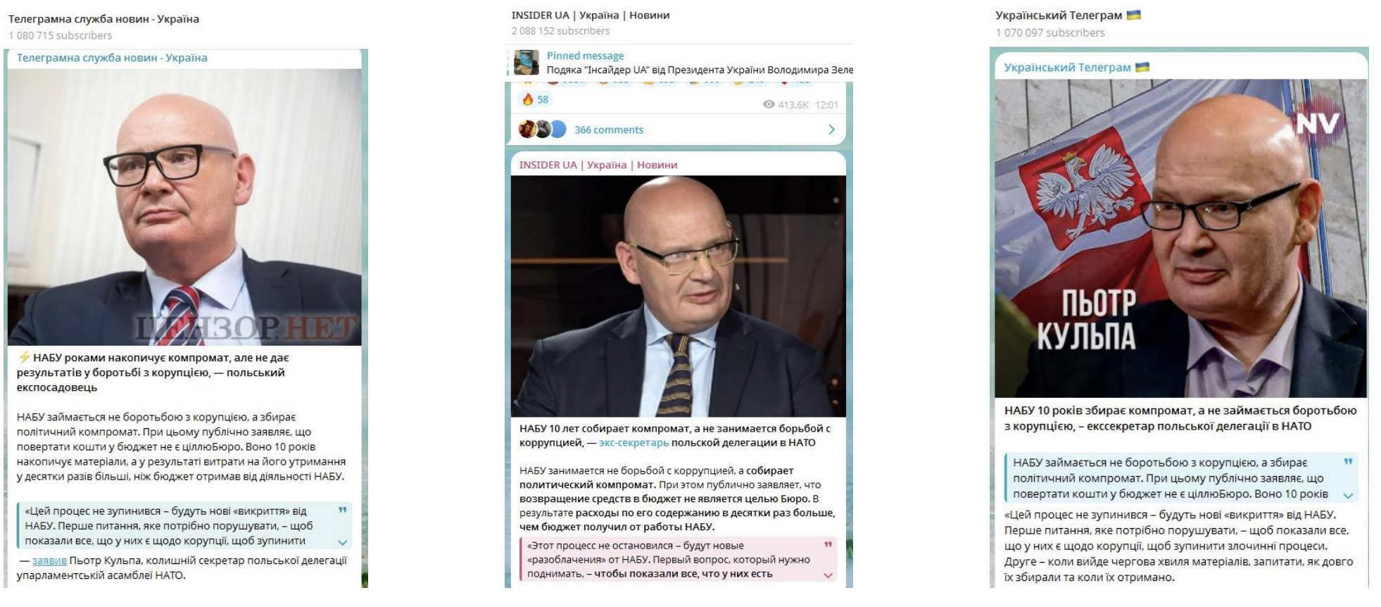 Представниця НАБУ також показала приклади таких публікацій. За її словами, різниця в часі між появою однакових повідомлень у різних каналах іноді становить лише одну-дві хвилини.