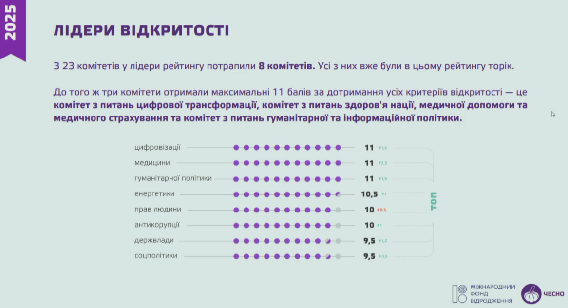 Скришот презентації Руху “ЧЕСНО”Комітет з питань цифрової трансформації, Комітет з питань здоров’я нації та медичної допомоги та Комітет з питань гуманітарної та інформаційної політики отримали максимальні 11 балів за дотримання усіх критеріїв відкритості. Вони опублікували всю документацію та відео, крім виїзних позачергових засідань. Решта комітетів серед лідерів рейтингу дотримувалися більшості вимог щодо відкритості, але інколи пропускали публікацію кількох стенограм чи інших документів.