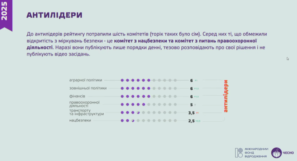 скришот презентації Руху “ЧЕСНО”До антирейтингу за 2025 рік потрапили шість комітетів, які отримали менше, менш ніж половину балів за критеріями відкритості ЧЕСНО. У 2024 році таких було сім.