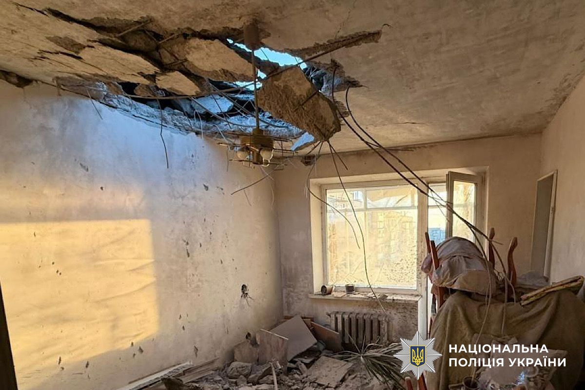 Діра у стелі квартири на Дніпропетровщині, куди поцілив російський снарядПо троє цивільних дістали травм на Сумщині та Запоріжжі: у першому випадку мова йде про трьох чоловіків, а у другому — про двох поліціянтів та місцевого із Запорізького району.