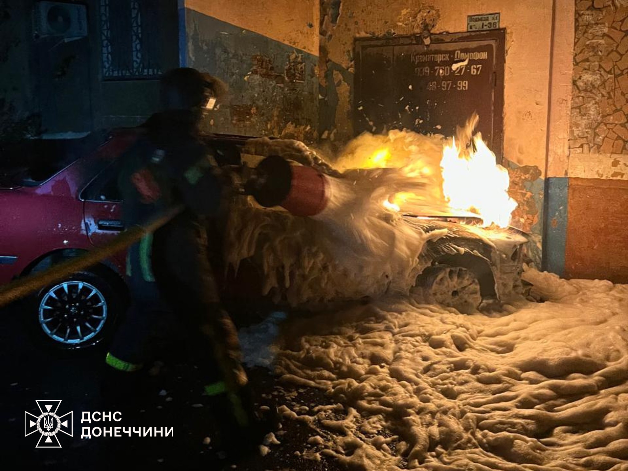 Рятувальник гасить займання автівки, що потрапила під удар РФ на Донеччині