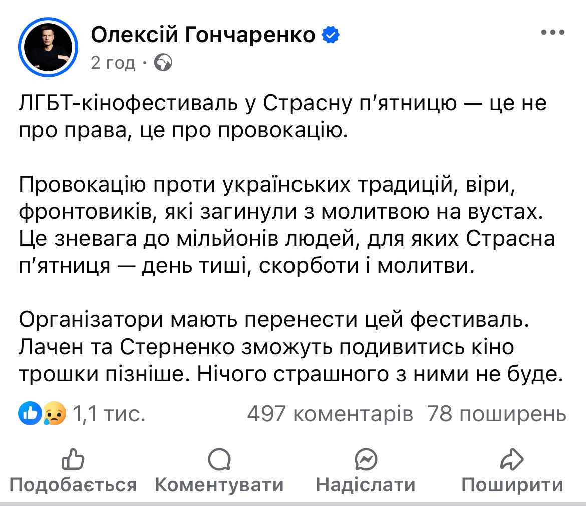 Народний депутат Олексій Гончаренко також виступив із критикою, назвавши фестиваль провокацією, спрямованою проти традицій, віри та памʼяті захисників. Він вважає, що проведення заходу у Страсну п’ятницю ображає почуття мільйонів людей, тому закликав змінити дати.