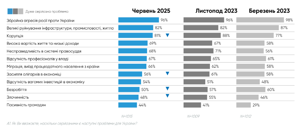 Опитані всередині України люди поставили корупцію в один ряд проблем з війною та руйнуваннями, спричиненими російськими обстрілами.