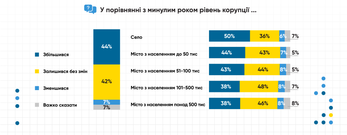 Погляди на динаміку корупції розділилися: 44% респондентів бачать зростання, 42% – не бачать змін узагалі, і лише 7% переконані, що рівень корупції зменшився, якщо порівнювати з минулим роком. Зростання рівня корупції опитані більше помічають у селах та менших населених пунктах.