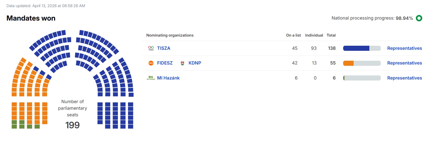 Натомість партія прем’єр-міністра Віктора Орбана “Фідес” набрала 38,43% голосів та отримала 55 місць у парламенті. Орбан ще 12 квітня визнав поразку та привітав з перемогою лідера партії “Тиса” Петера Мадяра.
