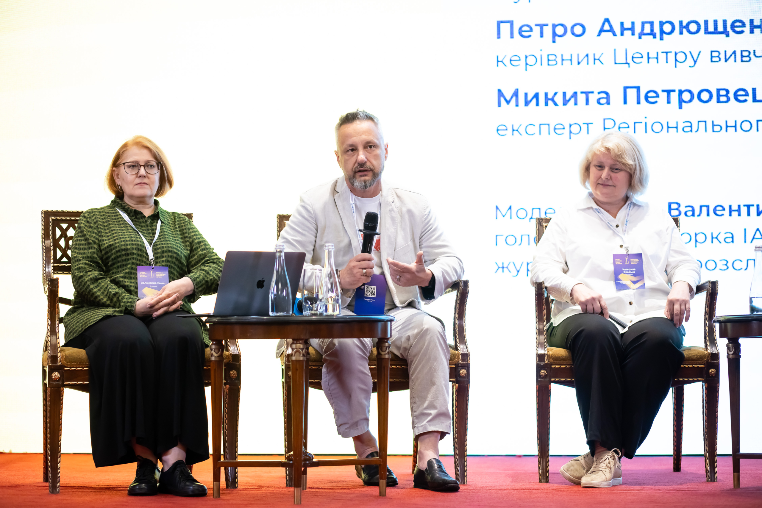 На фото: Валентина Самар, Петро Андрющенко та Катерина Яресько“Виникають певні питання: яка кількість борошна переробляється з нашого викраденого зерна і потрапляє на ринки наших партнерів? Я думаю, що всі будуть здивовані. На жаль, на офіційному рівні в Україні цими питаннями ніхто не займається. Всі ініціативи у цій сфері мають громадський характер або ці питання досліджують журналісти, громадські активісти чи інші зацікавлені сторони, але точно не держава”, – розповів Петро Андрющенко.