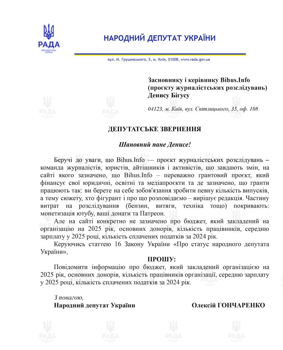 Депутатське звернення Олексія Гончаренка до редакції Bihus.Info. Фото: з телеграм-каналу Олексія ГончаренкаЗа його словами, ця інформація потрібна йому, щоб написати листа донорам та запитати, чи погоджували вони вихід “розслідування” про президента комітету ПАРЄ та члена Бюро ПАРЄ – тобто про самого Олексія Гончаренка.