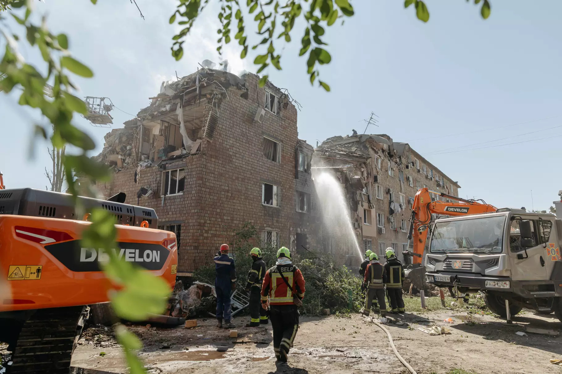 Обстріляна РФ п’ятиповерхівка у Дарницькому районі Києва під час рятувальних робіт 28 серпня 2025 року. Фото: МВСРоботи тривали понад 30 годин, а займались розбором завалів та допомогою постраждалим тисячі фахівців, що мінялись що кожні кілька годин, як розповідають посадовці.
