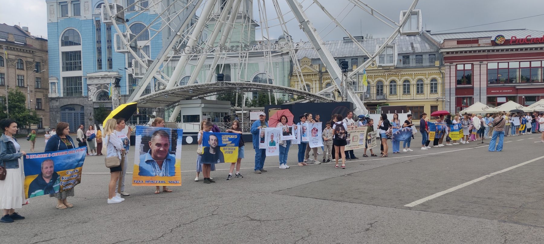 Фото: ZMINAПід час заходу, який традиційно відбувся на Подолі, учасники вишикувалися біля оглядового колеса у два ряди. Стоячи один навпроти одного, вони тримали в руках плакати з гаслами та портретами своїх рідних.