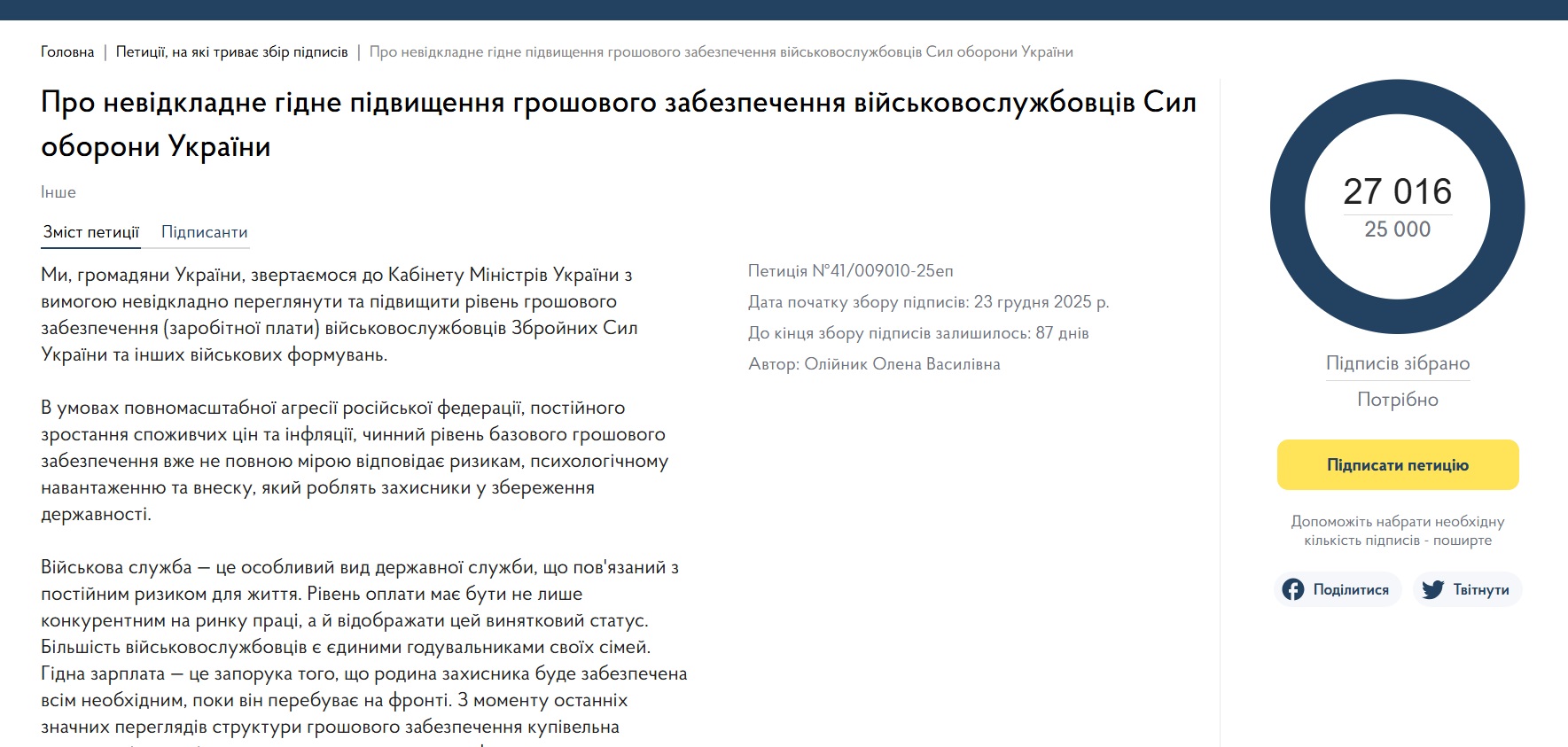 Необхідну кількість підписів для розгляду набрала петиція до уряду, якою вимагають переглянути та підвищити рівень заробітної плати військовослужбовців Збройних сил України та інших військових формувань.