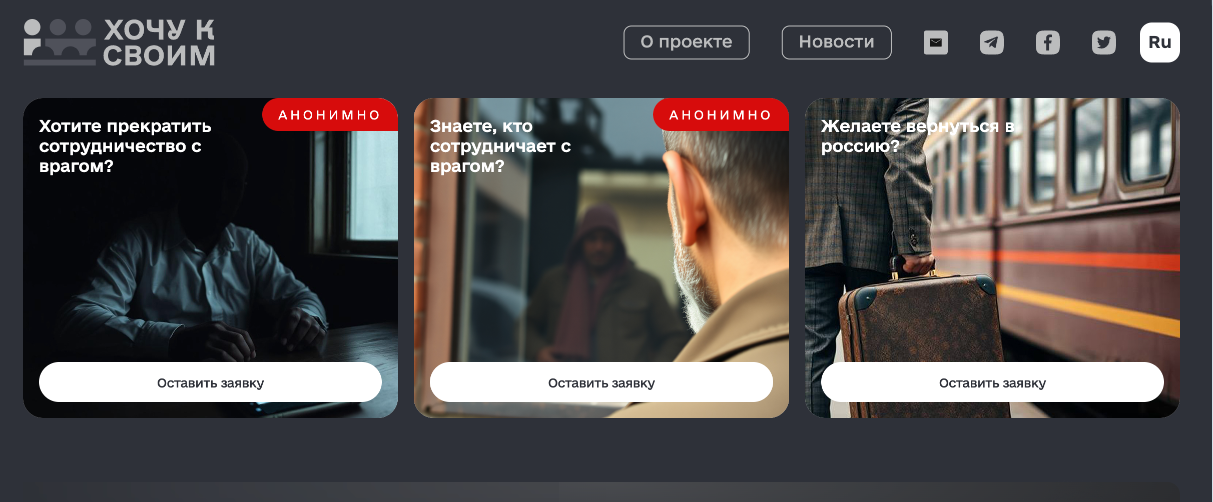 Також через спеціальну форму на сайті можна подати три типи заявок: “Бажаєте припинити співпрацю з ворогом?”, “Знаєте, хто співпрацює з ворогом?” та “Бажаєте повернутися до Росії?”. За інформацією Уповноваженого Верховної Ради України з прав людини, повернення осіб здійснюватиметься через попереднє узгодження за допомогою каналу комунікації між ним та уповноваженою з прав людини в РФ.