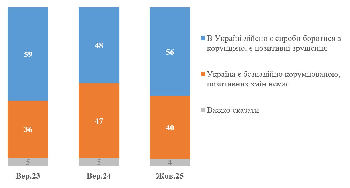 Фото: “Доступ до правди”На початку жовтня 2025 року 56% опитаних вважають, що в країні справді є спроби подолати корупцію. Частка тих, хто бачить Україну безнадійно корумпованою, становить 40%.