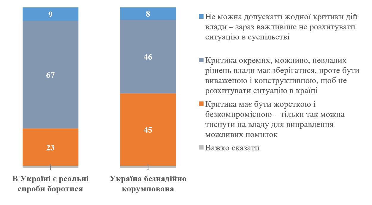 Серед тих, хто вважає Україну безнадійно корумпованою, більше людей наполягають на безкомпромісній критиці – 45%. Водночас навіть у цій групі понад половина (54%) схиляються до поміркованішої позиції або взагалі проти критики.