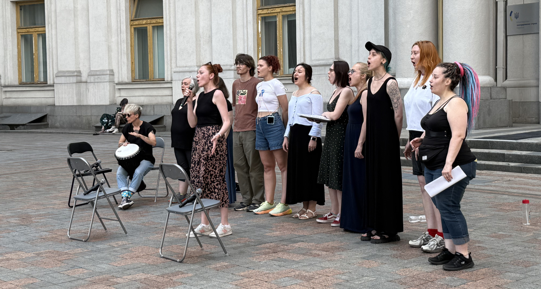 Фото: Яна Радченко / ZMINAЗавершився день виступом харківського квір-хору Queer-essence. Колектив, заснований у 2019 році в PrideHub, вкотре нагадав, що активізм буває різним – зокрема музичним. Учасники хору виконали програму, присвячену темам видимості, гідності та єдності ЛГБТІК+ спільноти, і завершили день гучним, натхненним фіналом.