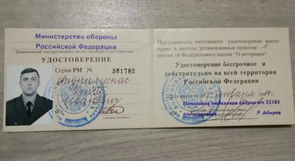 Посвідчення військового РФ Дениса Андріяускаса. Фото з соцмереж / ЦЖР4 квітня 2022 року потерпілого чоловіка перевезли до захопленого окупантами Біляївського ліцею в Новоолександрівській сільській громаді Бериславського району. Там чоловіка утримували до 1 серпня 2022 року і катували – зокрема той же Андріяускас. Того ж дня окупанти вивезли його на околиці села Михайлівка цієї ж громади й відпустили без надання жодних документів про причини затримання.