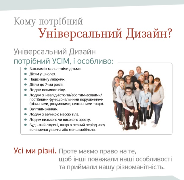 У буклеті йдеться про те, що проблема впровадження універсального дизайну важлива не лише для людей з інвалідністю, але й для батьків маленьких дітей, для людей похилого віку, чи навіть для тих молодих людей, які отримали незначну травму і тимчасово не можуть вільно пересуватися.