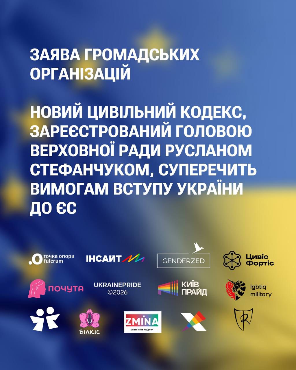 “Особливе занепокоєння викликають норми, які унеможливлюють судове визнання факту існування сімейних відносин між людьми однієї статі. У документі відсутні будь-які положення, що дозволяли б реєстрацію партнерств або іншу форму правового визнання таких стосунків. Ці положення створюють ризик подальшого віддалення України від європейської системи прав людини, до якої Україна прагне приєднатися, і водночас залишають ЛГБТІК+ без реального правового захисту їхніх сімей”, – йдеться в заяві.