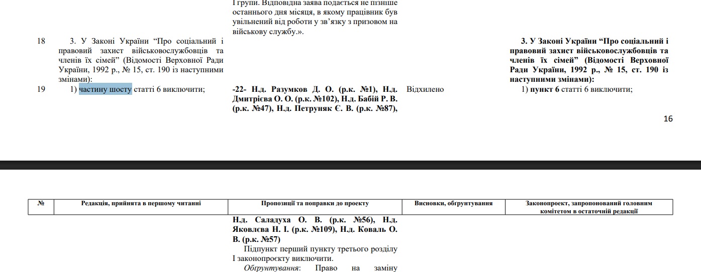 Судячи з порівняльної таблиці, розглянутої профільним комітетом 10 лютого 2026 року, до другого читання вирішили прибрати зі статті 6 закону про соцзахист частину 6. Ця норма стосувалась права на заміну виконання військового обов’язку альтернативною (невійськовою) службою, якщо перше суперечить релігійним переконанням громадянина.