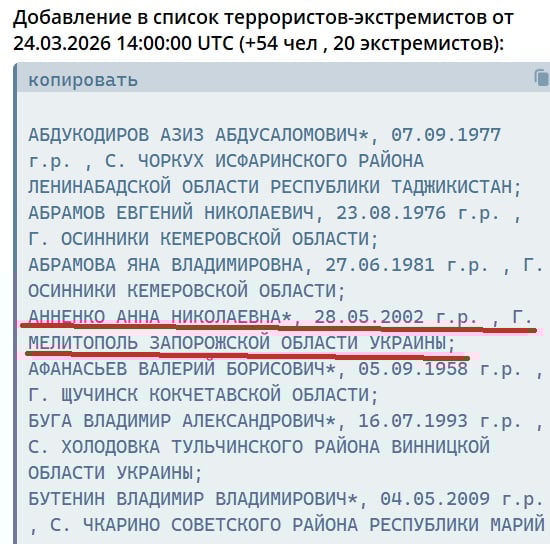 Фото: РІА-ПівденьЗа даними медіа, упродовж лютого–березня 2026 року до оновленого переліку внесли щонайменше трьох уродженців Мелітополя та понад два десятки жителів Запорізької й Херсонської областей. Загалом за цей період список поповнився 25 іменами: 13 жителів Запорізької області, 8 уродженців Херсонщини та 4 мешканців окупованого Криму. Усі вони були фактично визнані “злочинцями” без суду. Тобто здебільшого це незаконно ув’язнені РФ українці.