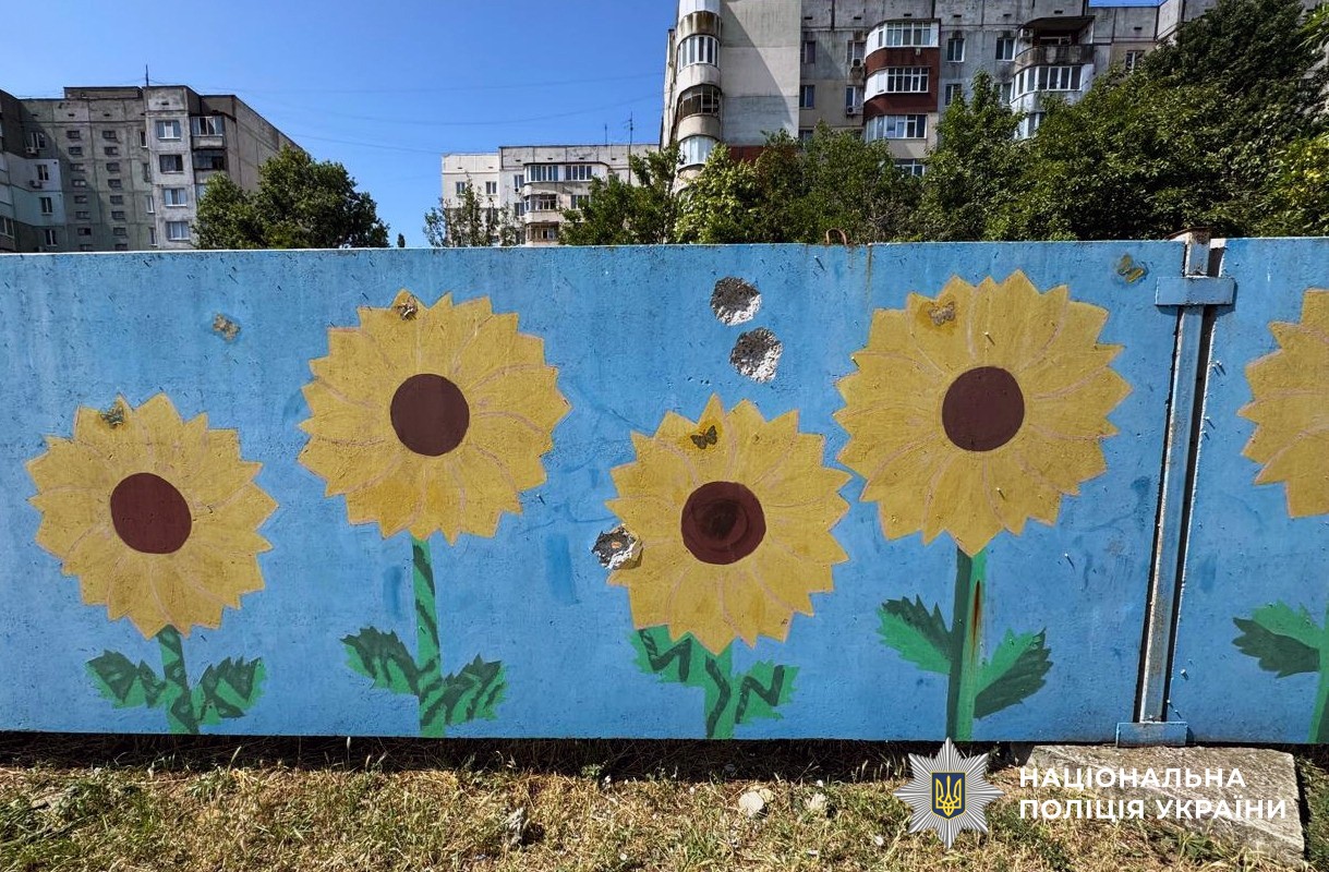 Сліди від влучання осколків на паркані в Херсонській області