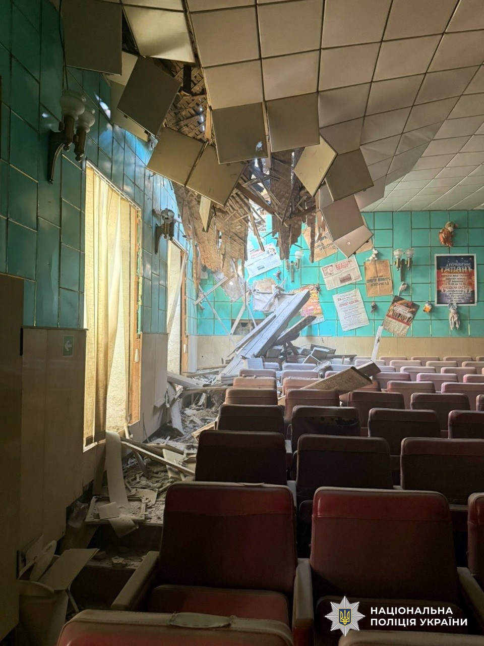 Руйнування в актовому залі однієї з будівель, обстріляних РФ на Херсонщині за добу 22 вересня 2025 року