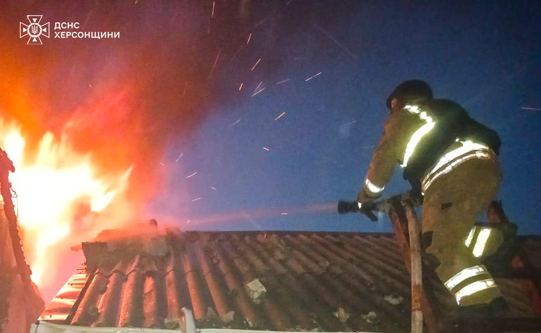 Пожежник тушить займання на даху житлового будинку, який потрапив під російський обстріл на Херсонщині 12 серпня 2025 рокуНа Дніпропетровщині минулої доби постраждала мешканка Марганця, по будинку якої росіяни завдали удару безпілотником.