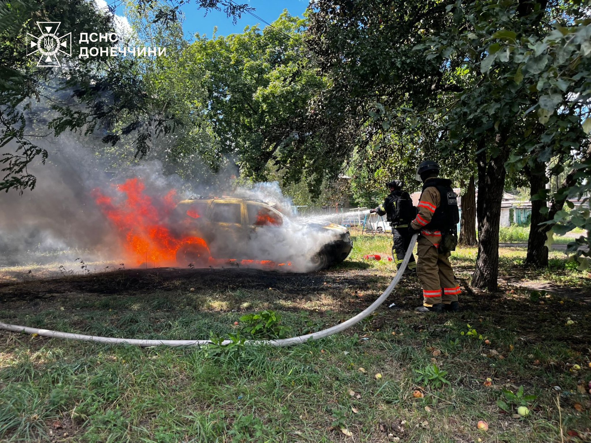 Рятувальники тушать автівку, яка спалахнула після російського удару на Донеччині 12 серпня 2025 рокуЩе одна загибла за минулу добу людина – це мешканка Широкої Балки на Херсонщині. Армія РФ обстріляла з артилерії населений пункт, поціливши прямо по подвір’ю загиблої.