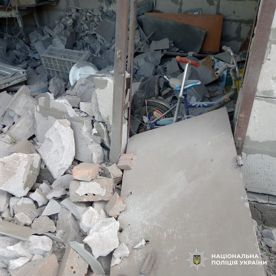 Дитячий велосипед стирчить з-під уламків будинку в Дніпропетровській області, який російські військові обстріляли 12 серпня 2025 рокуДо зведення за минулу добу також потрапили Запорізька та Харківська області, втім там минулося без жертв та травмованих, але лишилися масштабні руйнування.