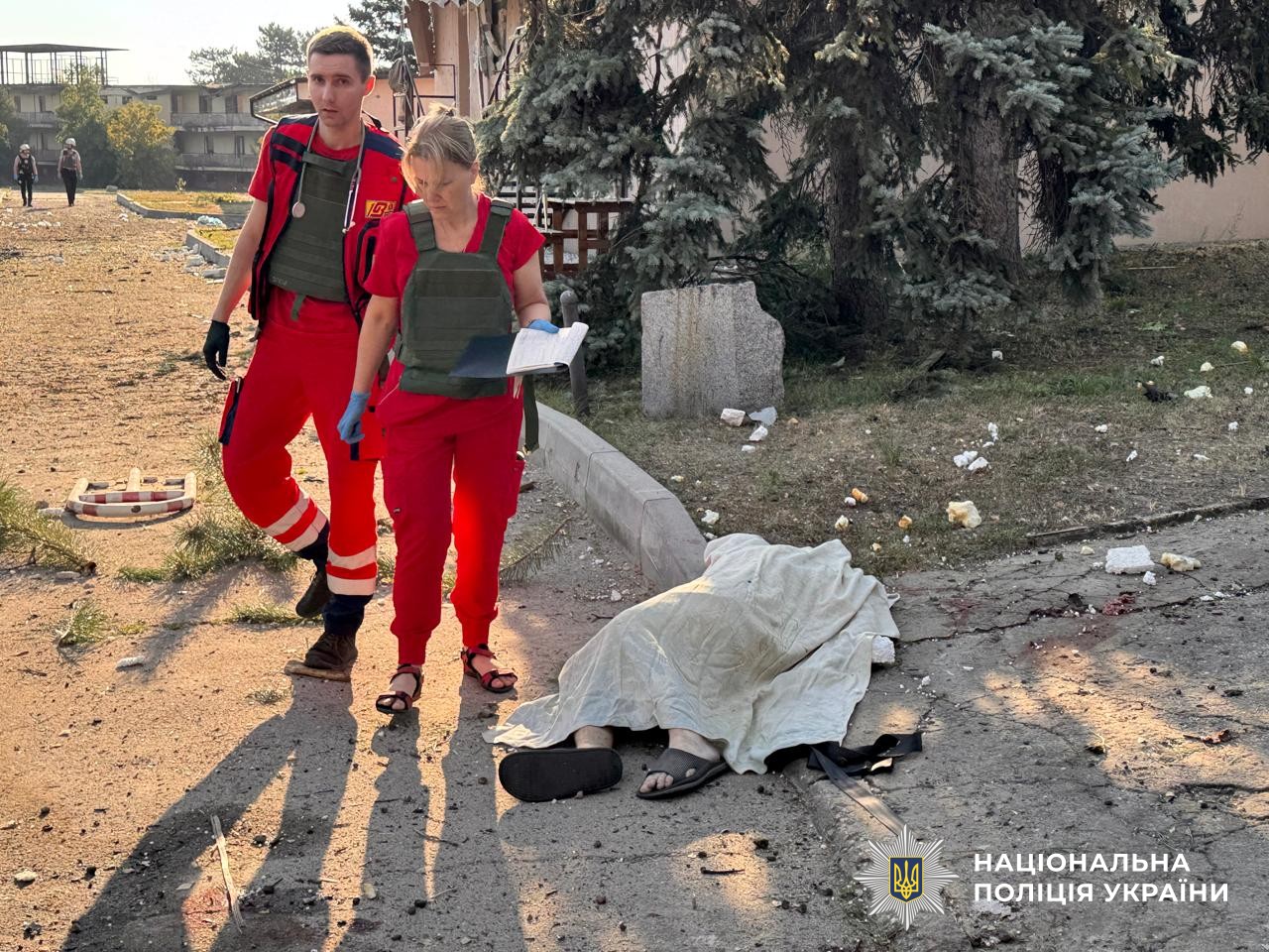 Медики поряд з тілом загиблої людини на базі відпочинку у Запорізькій області, на яку російські військові скинули керовану авіабомбу зранку 6 серпня 2025 рокуУ Донецькій області за добу ще шестеро людей дістали травм через удари по Костянтинівці, Білокузьминівці та Олексієво-Дружківці.