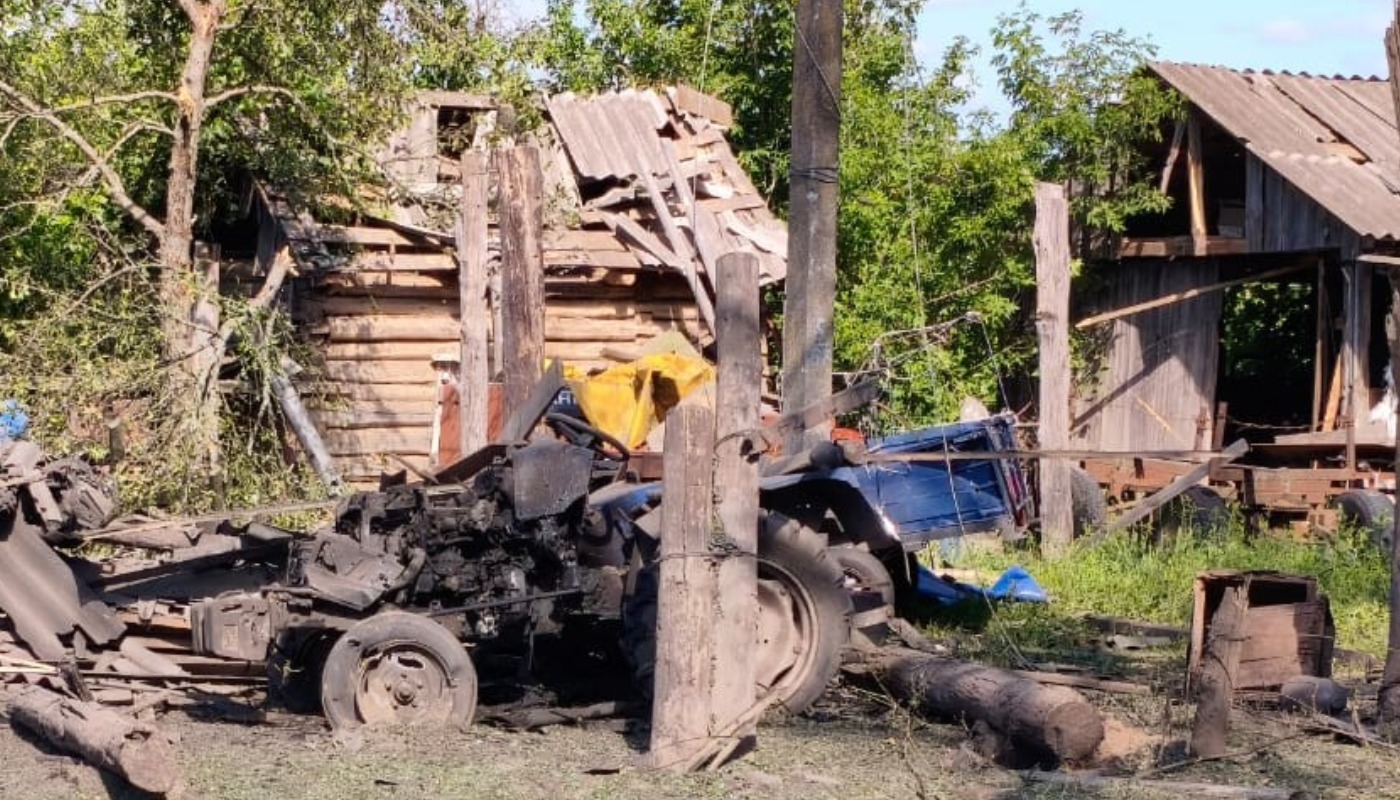 Подвір’я житлового будинку на Сумщині з понівеченим через удар армії РФ трактором. Фото: Нацполіція