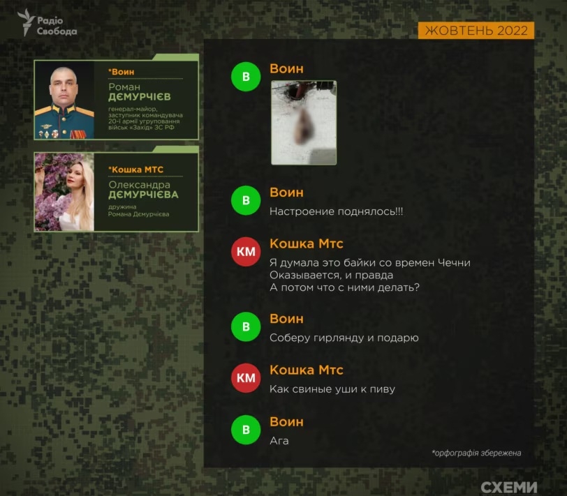 Щодо листування з дружиною, то там знайшли фото відрізаних у людей вух, які Демурчієв прокоментував так: “Настрій піднявся”. На світлину жінка реагує питанням про те, що з відрізаними частинами тіл роблять далі.