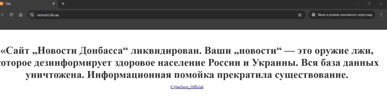 Злам сайту “Новини Донбасу”. Скриншот Юлії ДіденкоВідповідальність за злам взяла на себе група, яка називає себе “Кібер Серп. Підпілля України”. На сайті було розміщено повідомлення про нібито “ліквідацію” медіа та знищення всієї бази даних.