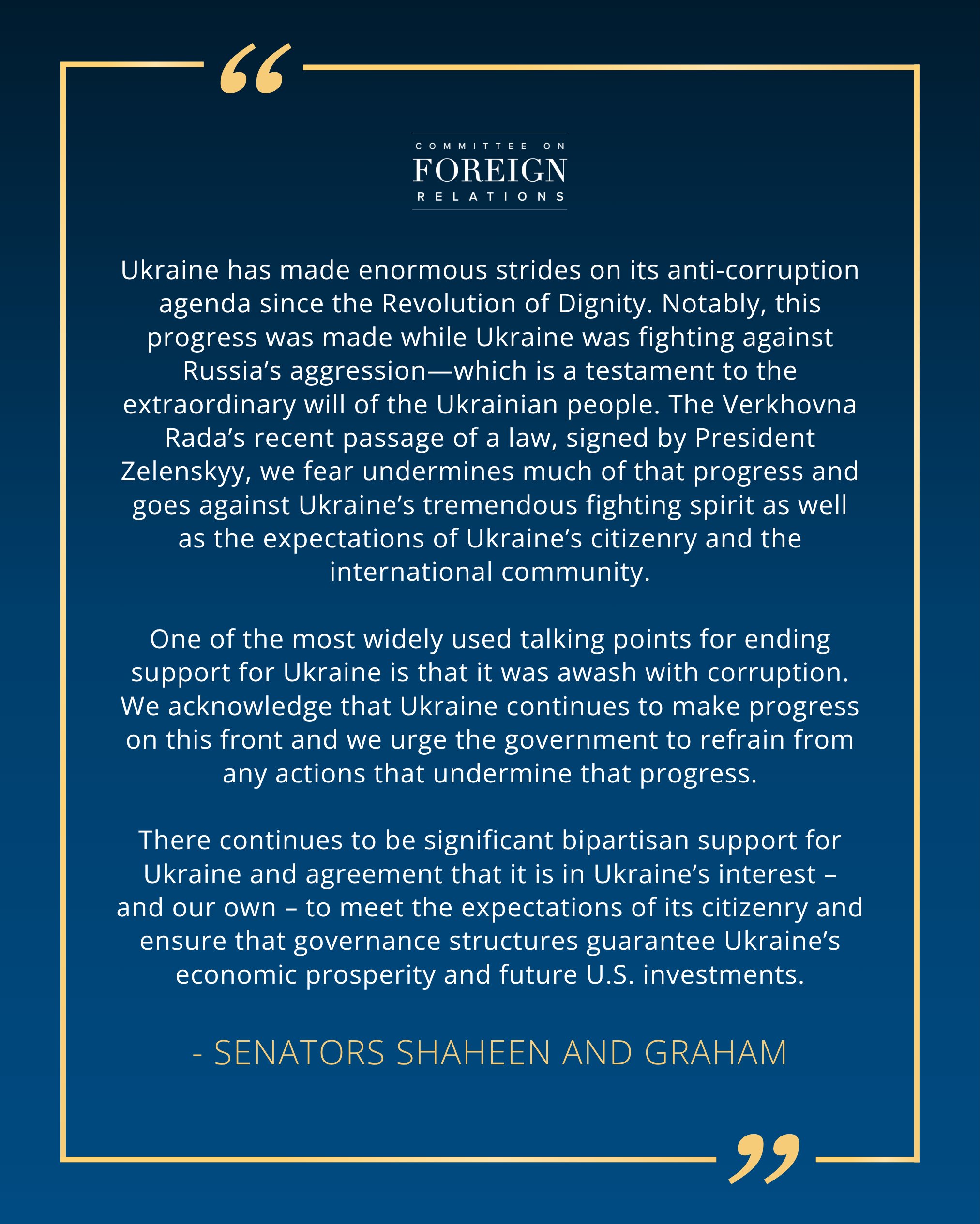 У США сенатори Джин Шахін від Демократичної партії та Ліндсі Грем від Республіканської партії висловили занепокоєння через ухвалений народними депутатами та підписаний президентом Володимиром Зеленським закон, що узалежнює антикорупційні інституції України від генпрокурора, підриває значну частину прогресу боротьби із корупцією.