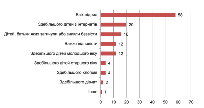 Здебільшого респонденти вважають, що окупанти депортують до Росії всіх підряд (58%). Утім, 20% зазначили, що насамперед примусово вивозять дітей з інтернатів, а ще 16% у групі ризику бачать дітей, батьки яких загинули або зникли безвісти.