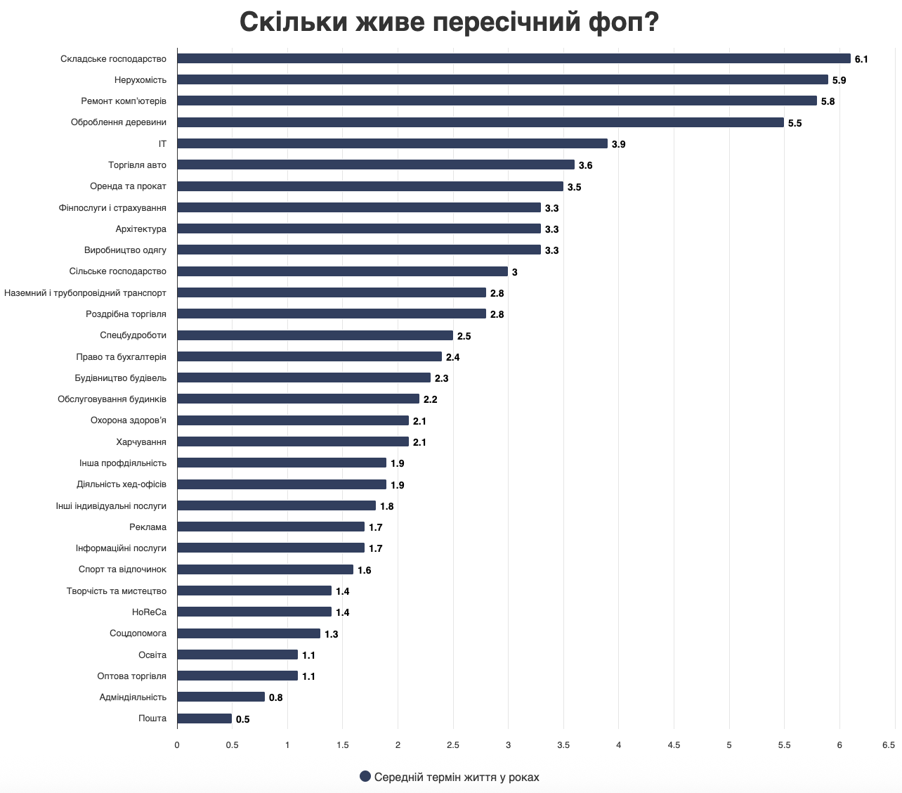 Найдовше в Україні працюють ФОПи у сфері складського господарства – понад шість років. Підприємці, які займаються операціями з нерухомістю, в середньому ведуть бізнес п’ять років і 11 місяців. Майже стільки ж – п’ять років і дев’ять місяців – працюють ФОПи, що ремонтують техніку, зокрема побутову.