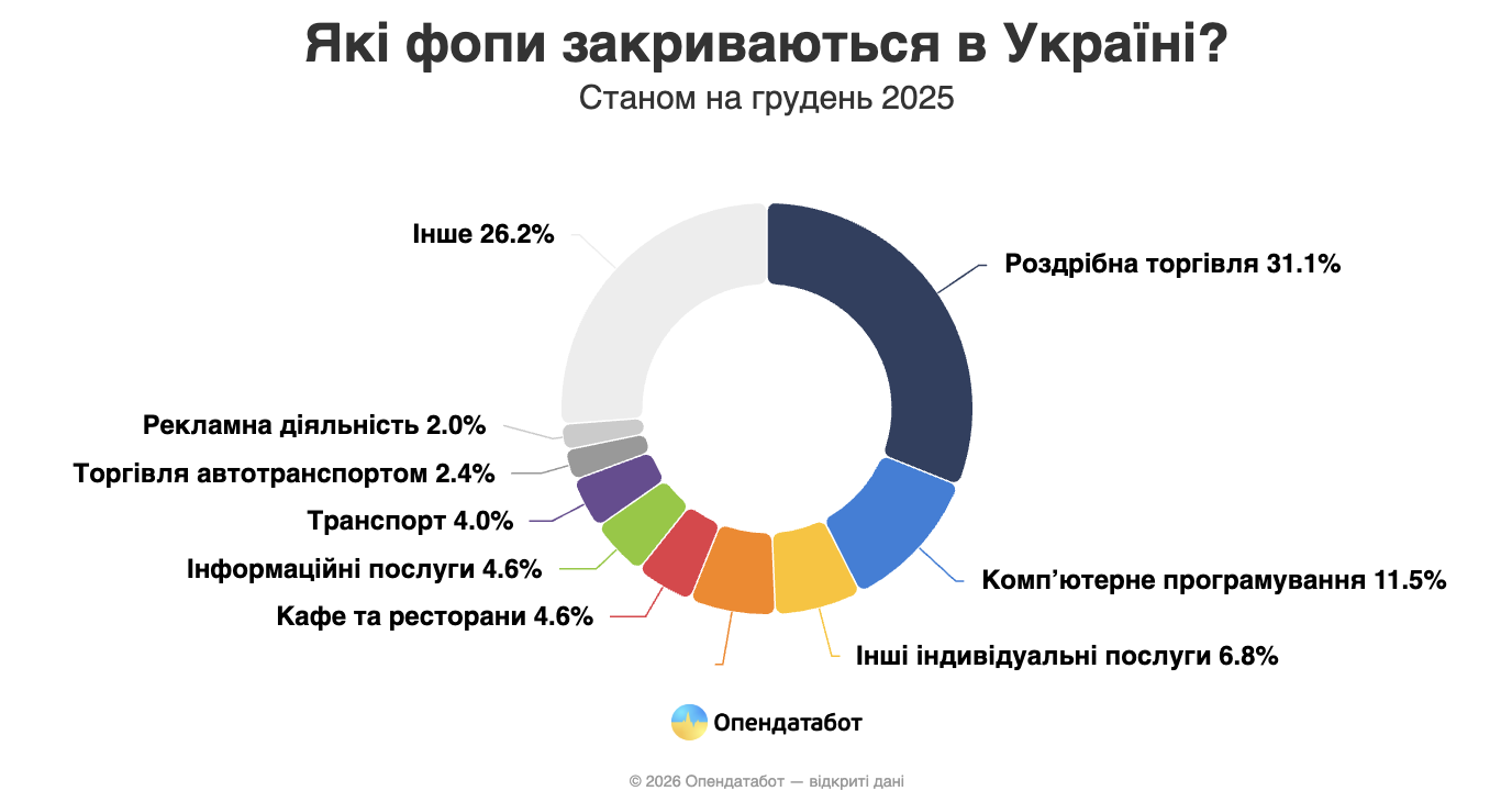 Другими за кількістю припинень стали підприємці у сфері ІТ. У 2025 році закрилися 28 668 айтівців – це кожен дев’ятий ФОП, який припинив роботу. Водночас ІТ-підприємці входять і до групи тих, хто працює довше за інших: у середньому майже чотири роки.