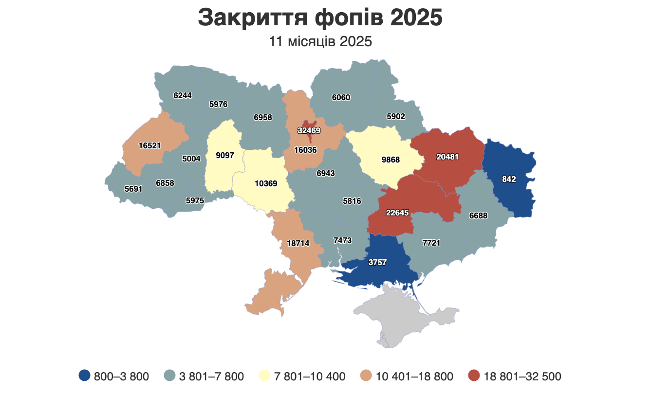 Найбільша кількість закриттів припала на Київ. Там 2025 року діяльність припинили 32 469 підприємців – це кожен восьмий ФОП, який закрився по країні. На другому місці опинилася Дніпропетровська область, де закрилися 22 645 ФОПів. Далі йдуть Харківська область із 20 481 закриттям, Одеська (18 714) і Львівська (16 521).