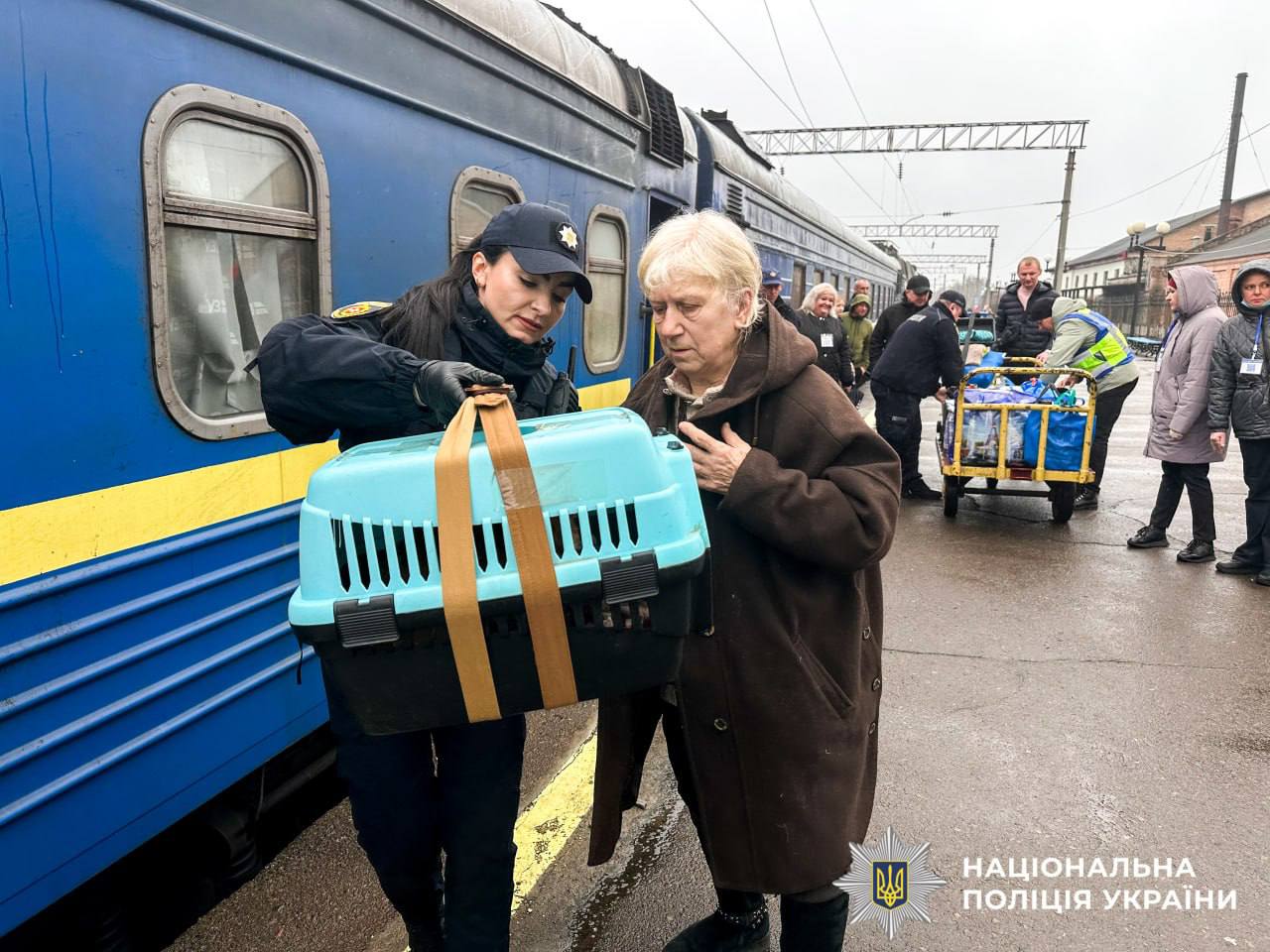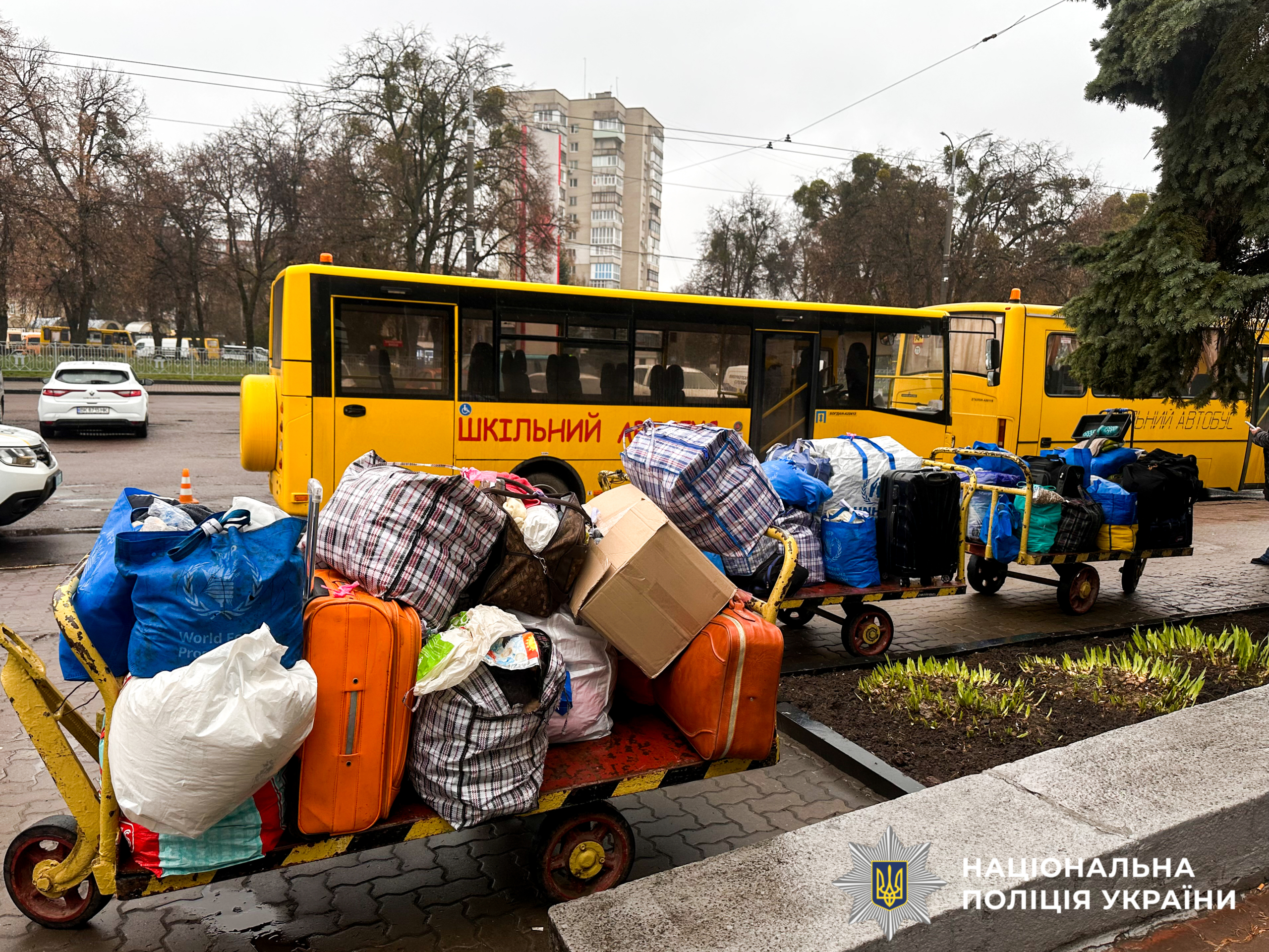 Речі евакуйованих біля автобусаНа вокзалі міста 18 людей, які поїхали з-під російських обстрілів, традиційно зустрічали поліціянти, медики, психологи, рятувальники та представники влади й соцслужб. Серед евакуйованих переважно літні, родини з дітьми та люди з інвалідністю.