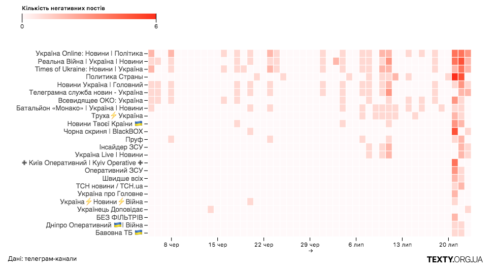 Канали відібрали серед сотні популярнихі у категорії “Новини та медіа” за версією аналітичного сервісу Telemetr.io, а також серед тих, що публікували негативні повідомлення (oppositional) про антикорупційників більше ніж один раз. Для визначення тональності повідомлень використали модель штучного інтелекту GPT-4.1.