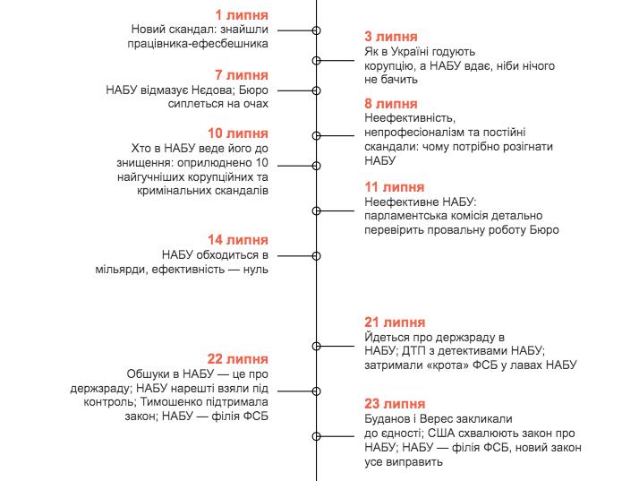 Ключові негативні наративи про НАБУ в телеграм-каналах у липні 2025 року. Інфографіка “Тексти”Частиною дискредитаційної кампанії стали також новини про обшук СБУ в антикорупційників, розповіді про витоки інформації з обмеженим доступом з НАБУ та можливі зв’язки детективів з росіянами, а також заклики “не підігравати ворогу”.