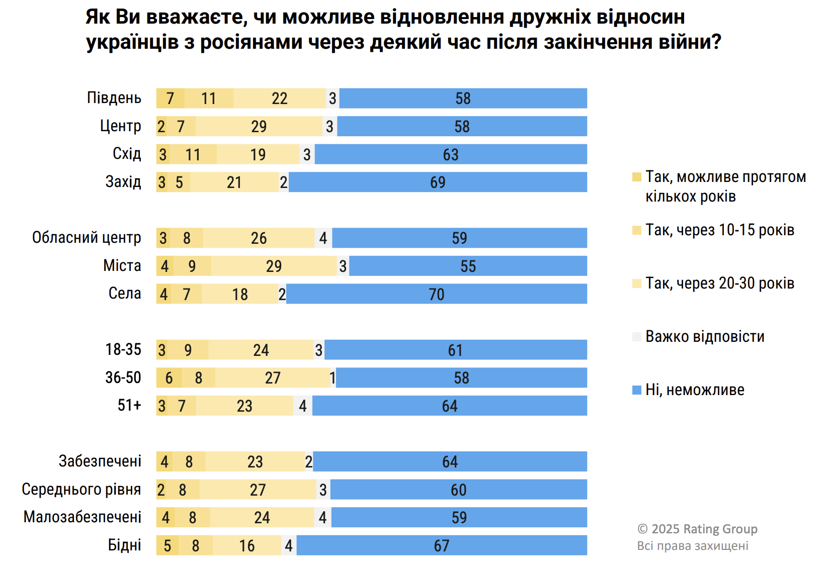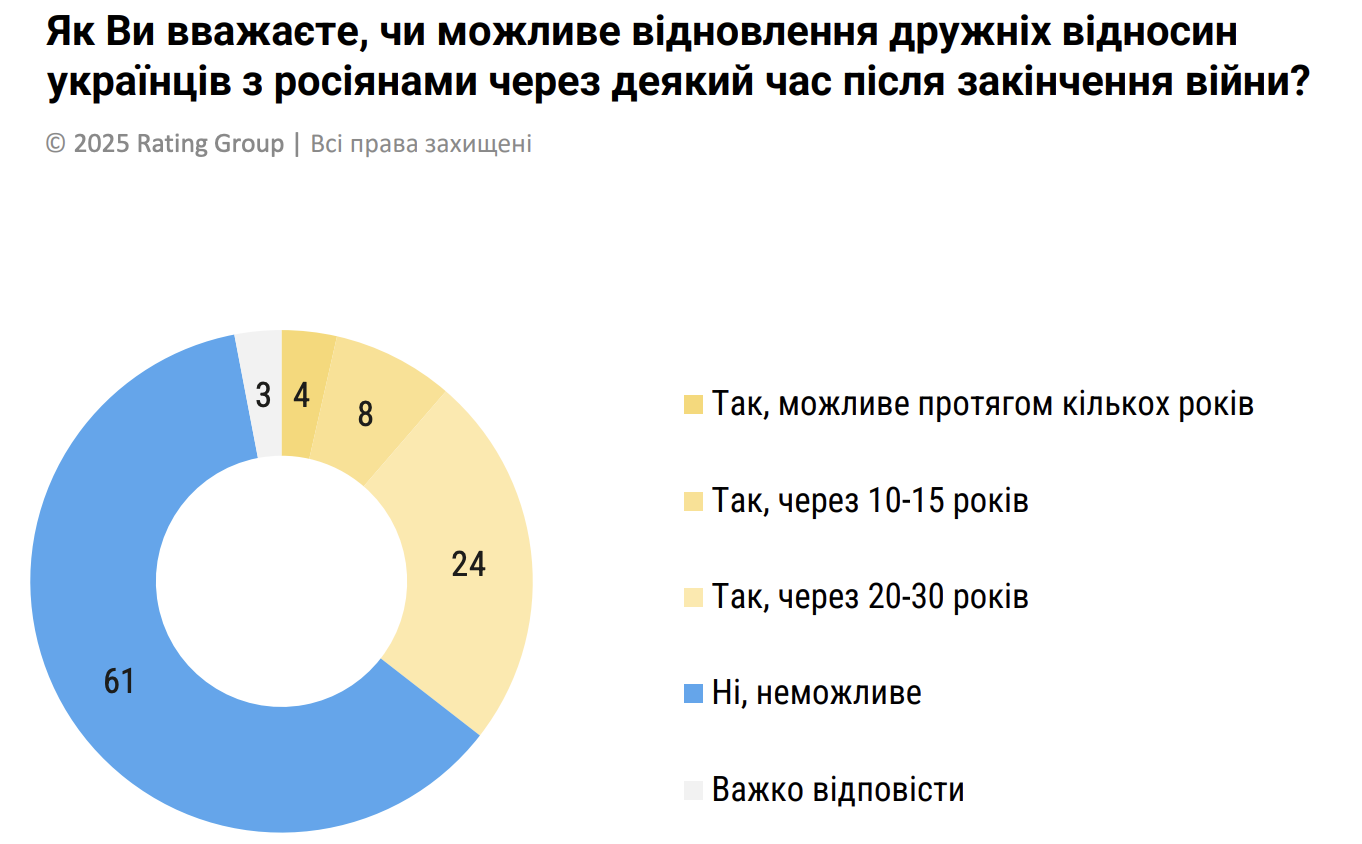 Більшість опитаних українців не вірять у відновлення дружніх відносин з росіянами навіть через десятиліття після війни. 61% респондентів вважають це неможливим навіть через багато років, тоді як 36% допускають таку можливість, але переважно у дуже віддаленій перспективі.