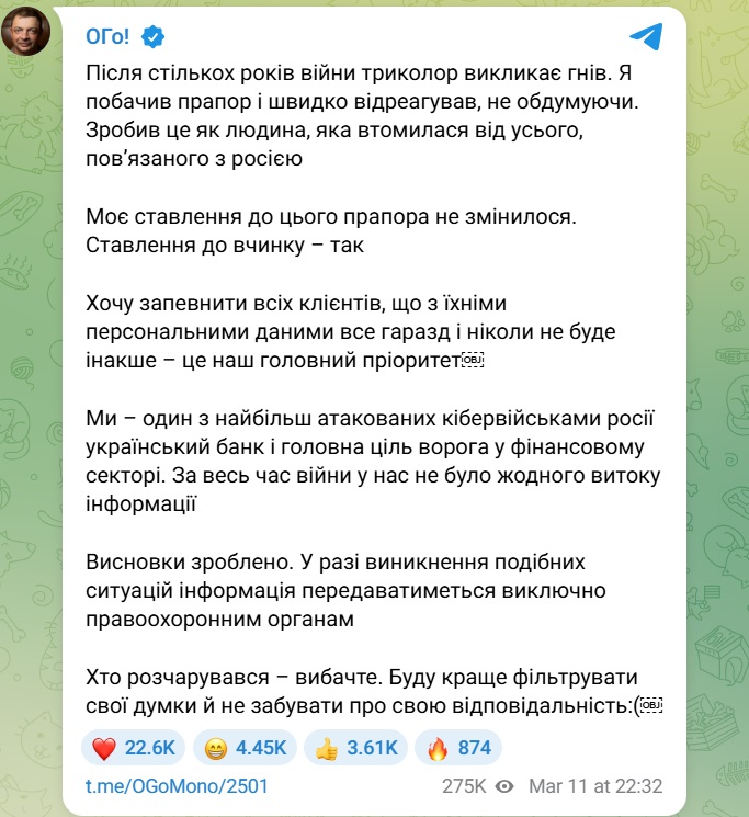Співвласник Монобанку Олег Гороховський перепросив користувачів мережі, які розчарувались після історії з публікацією фото доньки військового Карини Кольб, отримане під час перевірки. Дівчина сиділа на тлі прапора Словенії, що нагадував символ РФ, тож тепер її цькують.