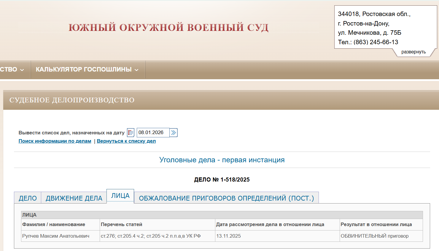 Максим Рупчов. Скриншот із пропагандистського сюжету російського телеканалуЗгідно з вироком, перші три роки Максим Рупчов має провести у в’язниці, решту строку – у колонії суворого режиму. Обвинувальний вирок суддя Південного окружного військового суду в Ростові-на-Дону Денис Галкін виніс ще 13 листопада 2025 року, однак публічно про нього стало відомо лише зараз.