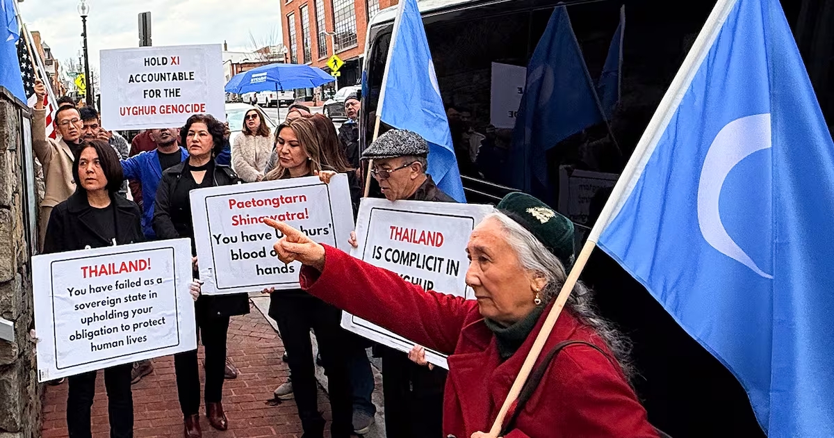 Протестувальники зібралися перед посольством Таїланду у Вашингтоні після того, як 40 уйгурів депортували з Таїланду до Китаю, 27 лютого 2025 року. Фото: RFA UyghurТак, уряд Таїланду, який раніше вже дозволяв сусіднім державам переслідувати та завдавати шкоди вигнаним дисидентам на своїй території, у лютому примусово повернув до Китаю 40 уйгурських чоловіків. Понад десять років їх утримували в імміграційному центрі з обмеженим доступом до адвокатів і медичної допомоги. Вони входили до більшої групи уйгурів, які намагалися втекти від репресій у китайському Сіньцзяні, прямувавши через Південно-Східну Азію до Туреччини.