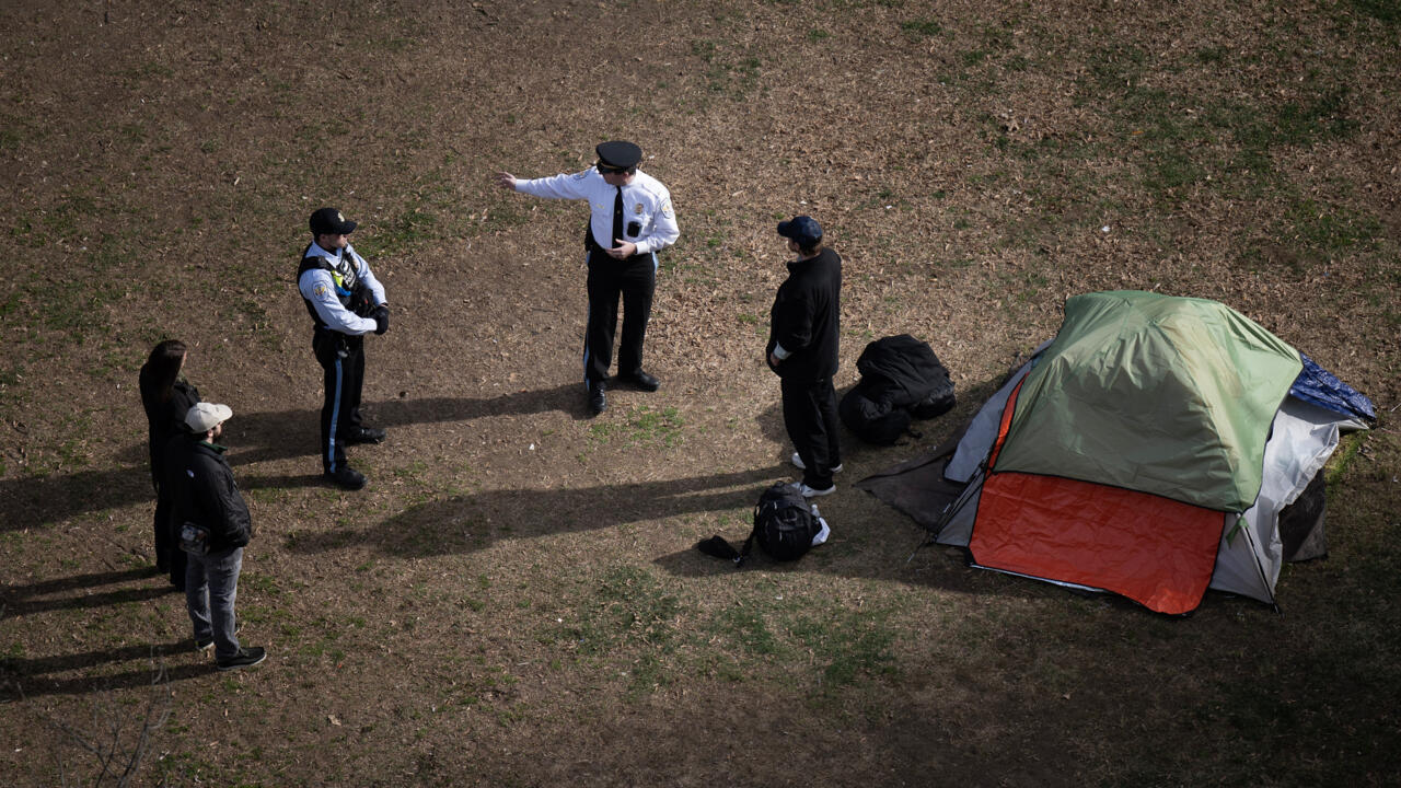Ілюстраційне зображення. Правоохоронці спілкуються з бездомним чоловіком поблизу намету, де він живе. Фото: Брендан Сміаловський / AFPЦього року Трамп уже розгортав бійців гвардії, щоб нібито стримати антимігрантські протести в Каліфорнії. Суд згодом постановив, що він міг зробити це незаконно.